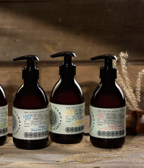 В ассортименте ETERIA COSMO представлены ароматические диффузоры на бесспиртовой гипоаллергенной основе в темных стеклянных бутылочках в аптечном дизайне и крафтовой экологичной упаковке, натуральные аромасвечи из соевого воска в стеклянных баночках, крафтовые ароматические саше из природной минеральной пудры, а также натуральные косметические средства для увлажнения и смягчения кожи рук и тела – жидкое мыло с активными увлажняющими компонентами, гели для душа без SLS и парабенов.