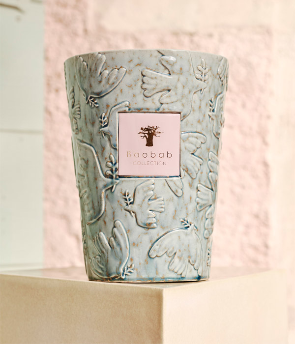 В нежно-зелёной, цвета селадона, керамике с тонкими патинированными отблесками ароматическая свеча Colombe открывает взгляду изваянных голубок, выступающих на её поверхности словно древний барельеф. Внутренняя глазурь — деликатного розового оттенка — наполняет изделие светлой вибрацией, отсылающей к традициям средиземноморской керамики.
