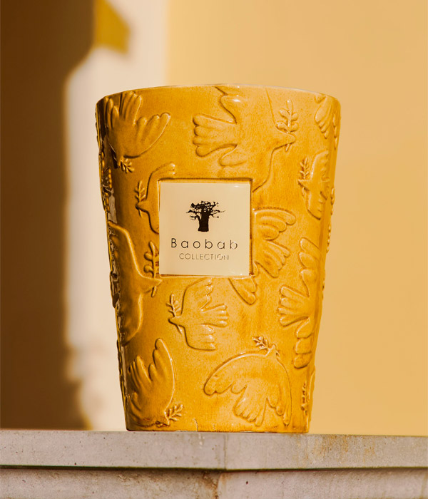 Сияющая в яркой, солнечной, залитой светом жёлтой глазури, свеча Dove являет взгляду изваянных голубей, которые словно парят на керамике, согретой средиземноморским светом. Этот оммаж южнофранцузской керамике дополнен матово-бежевой внутренней поверхностью, которая подчёркивает её лучезарную эстетику и усиливает ощущение света.