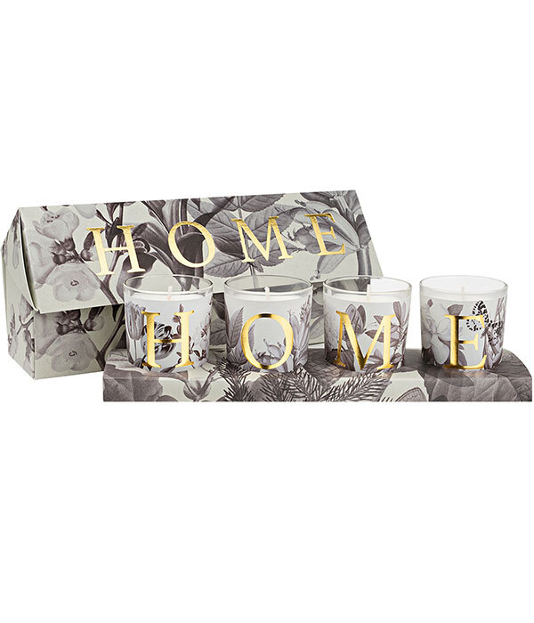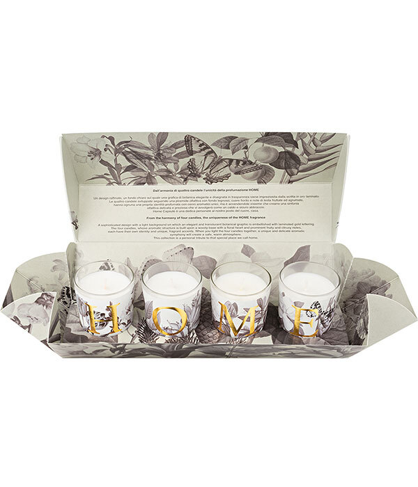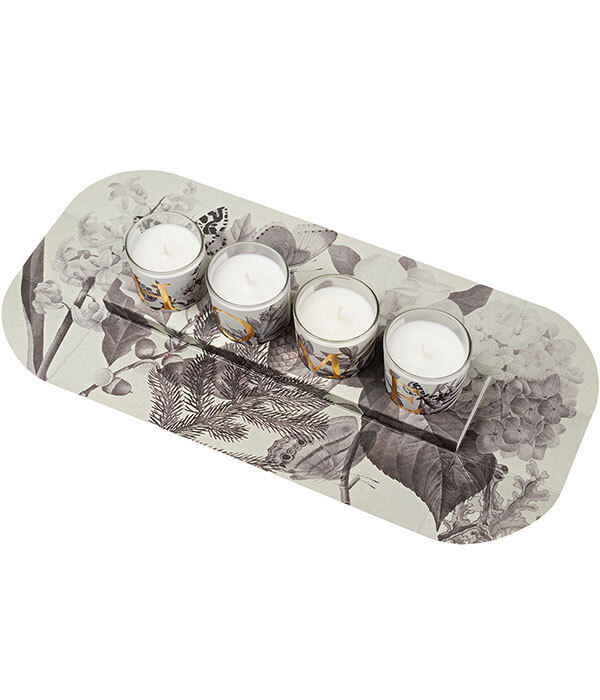Четыре свечи, ароматическая структура которых построена на древесной основе с цветочным сердцем и ярко выраженными фруктовыми и цитрусовыми нотами, каждая из которых обладает своей индивидуальностью и уникальными ароматическими акцентами.