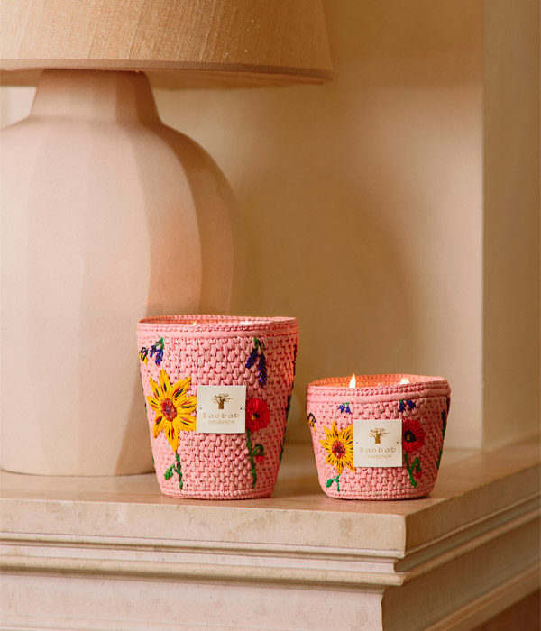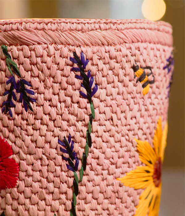 На малагасийском языке это слово означает «бутон» — тот драгоценный миг, когда стебель превращается в цветок. Нежная рафия розового оттенка расцветает рукотворной цветочной вышивкой, рождённой мастерицами на Мадагаскаре.