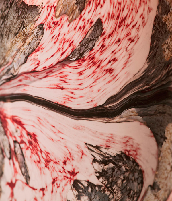 В оправе из выдувного стекла малиновых и синевато-серых полутонов свеча Manon демонстрирует изысканную мраморную текстуру, парящую на поверхности словно застывшие листья.
