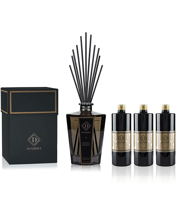 Диффузор объемом 1250 мл поставляется в виде вазы без наполнения. Ароматическая жидкость идет в комплекте в количестве 3-х рефиллов по 500 мл. Также к аромату прилагаются палочки из фибрового волокна.