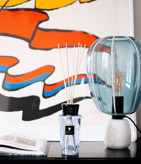 Домашний ароматический диффузор Nosy Iranja представляет собой переливающийся синий флакон с прозрачным стеклянным куполом с выгравированным "корневым" рисунком.