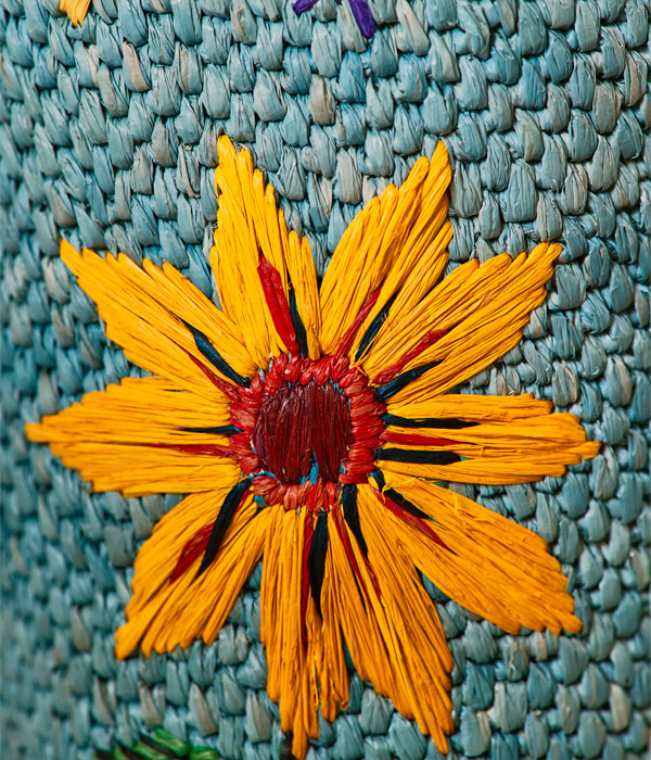 На малагасийском это слово означает «мёд». Бирюзовая рафия расцвечена вышитой пчелой — неутомимой посланницей природы.