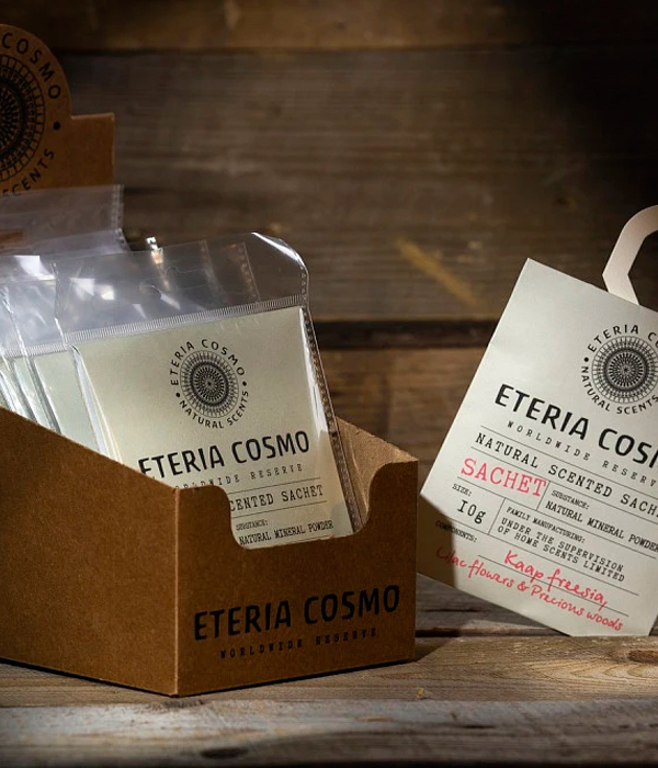 В ассортименте ETERIA COSMO представлены ароматические диффузоры на бесспиртовой гипоаллергенной основе в темных стеклянных бутылочках в аптечном дизайне и крафтовой экологичной упаковке, натуральные аромасвечи из соевого воска в стеклянных баночках.