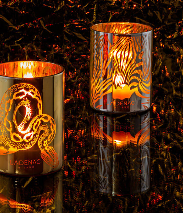 Сосуд для свечей произведен в специальной технике, которая при зажигании свечи позволяет увидеть животное, вдохновляющее эту свечу.